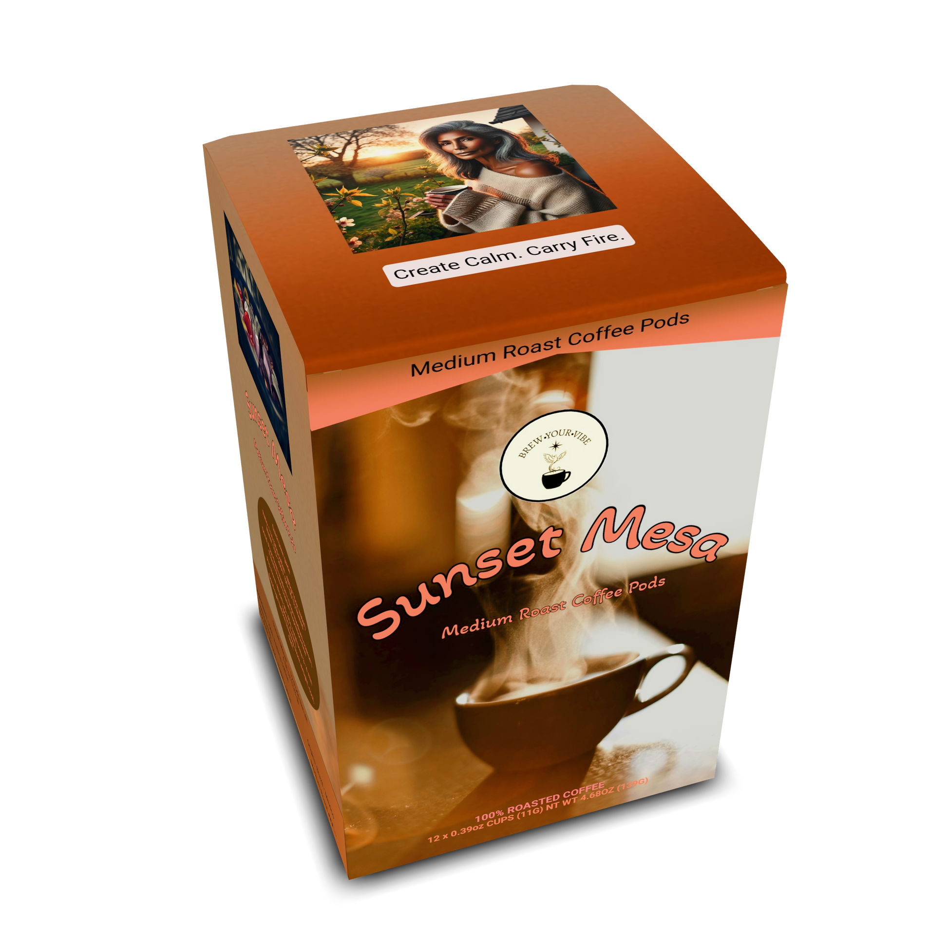 SUNSET MESA™ — Medium Roast Coffee Pods (12ct) - Tasting Notes: Chocolate-Almond • Maple • Citrus - Origins: Brazil • Mexico (Chiapas) — 100% Arabica