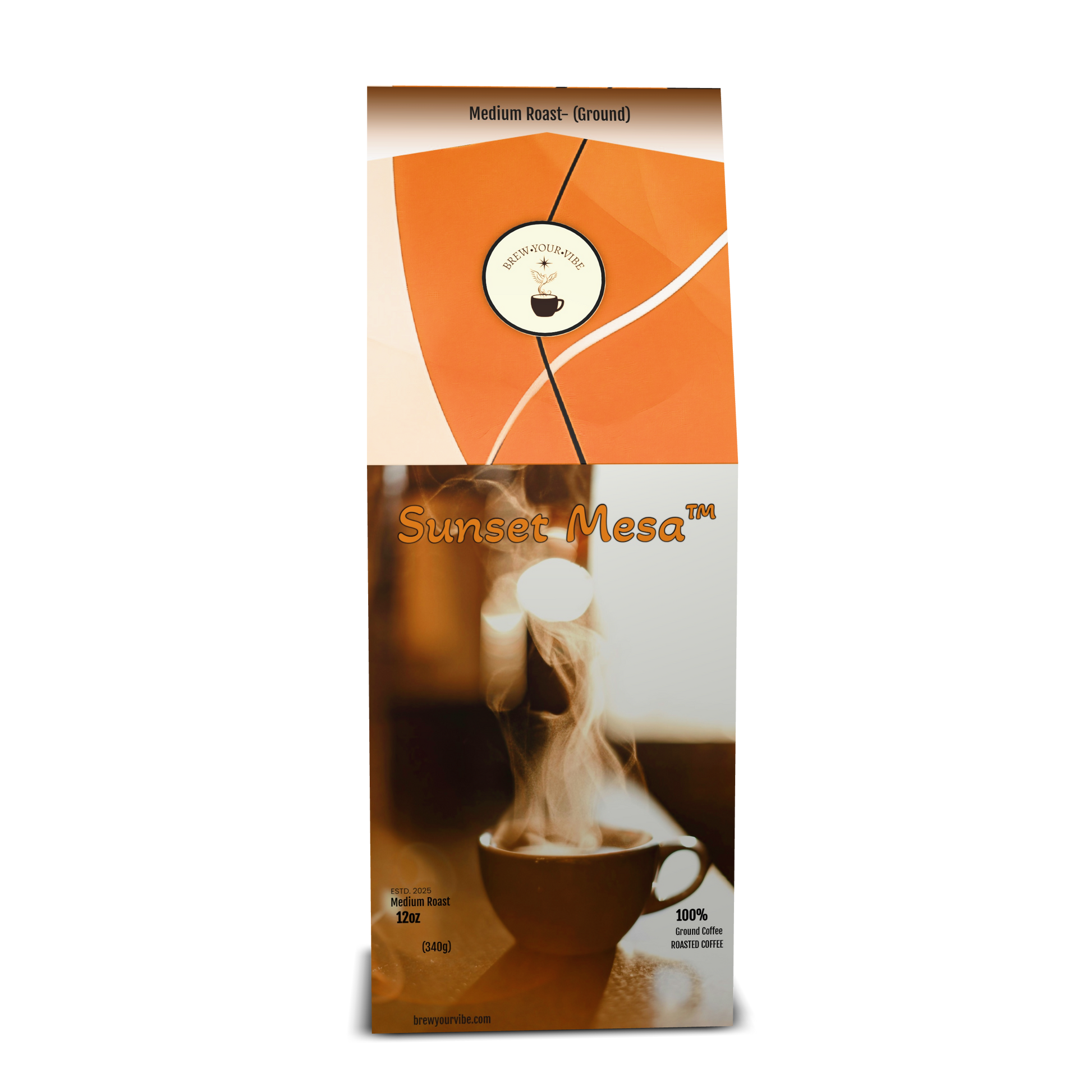 SUNSET MESA™ — Medium Roast Coffee (Ground) Tasting Notes: Chocolate-Almond • Maple • Citrus - Origins: Brazil • Mexico (Chiapas) — 100% Arabica