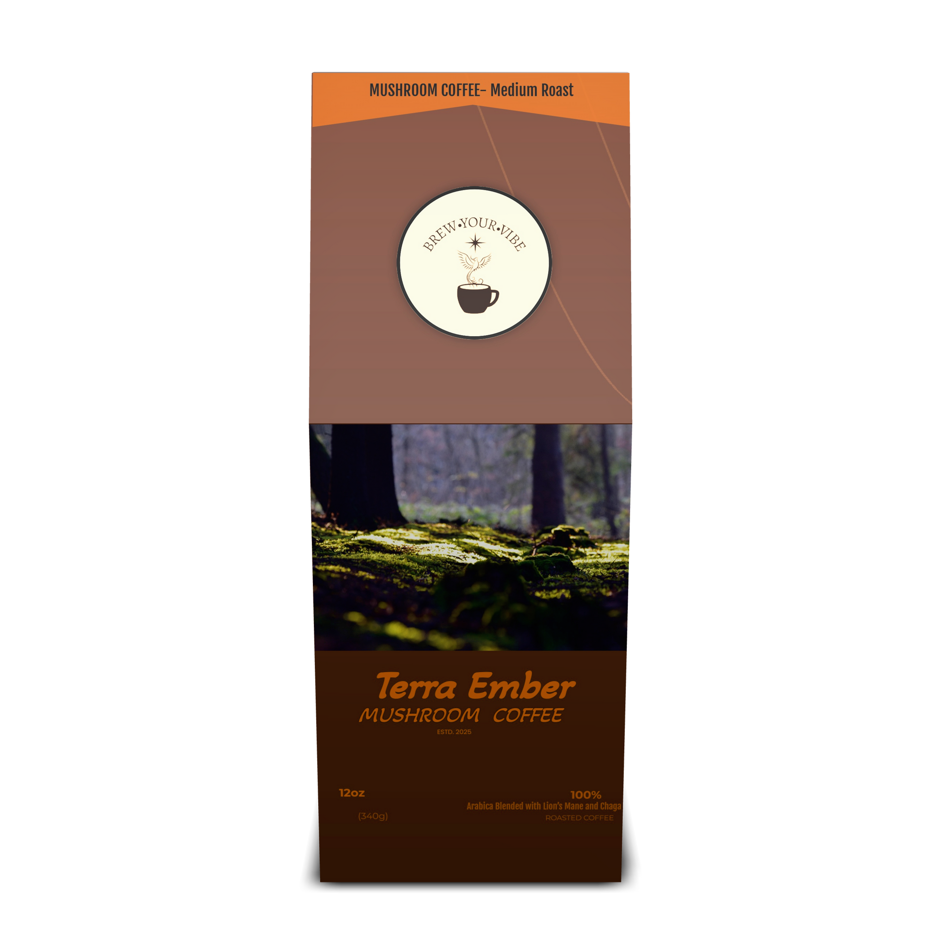 TERRA EMBER™ — Mushroom Coffee (Lion’s Mane and Chaga)- Tasting Notes: Cocoa • Toasted Almond • Gentle Earth - Origin/ Region: Brazil (Cerrado)• Mexico (Chiapas)